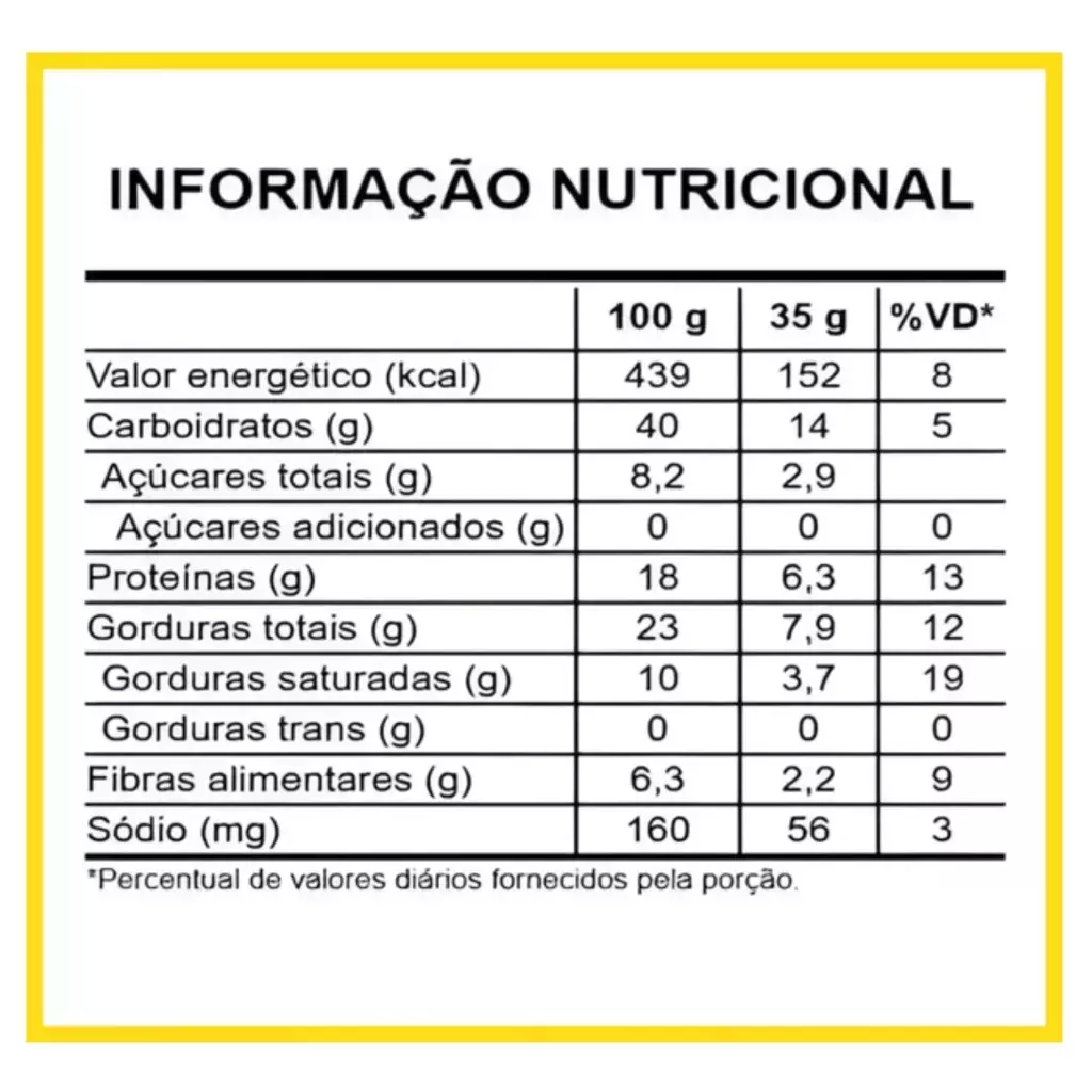 Contém derivados de amendoim, derivados de leite e derivados de soja. Pode conter amêndoas, aveia, avelãs, castanhas, castanha do Brasil, castanha de caju, macadâmia, nozes, pecã, pistache, ovos e soja.